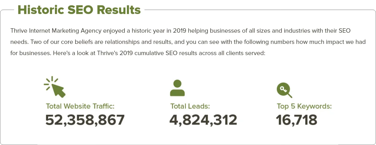 Thrive Internet Marketing Agency is a customer-focused SEO company. Our SEO experts work closely with our clients to develop personalized SEO strategies that drive long-term profitability. By using a proven, efficient and effective methodology, we are able to create high-quality, measurable results.